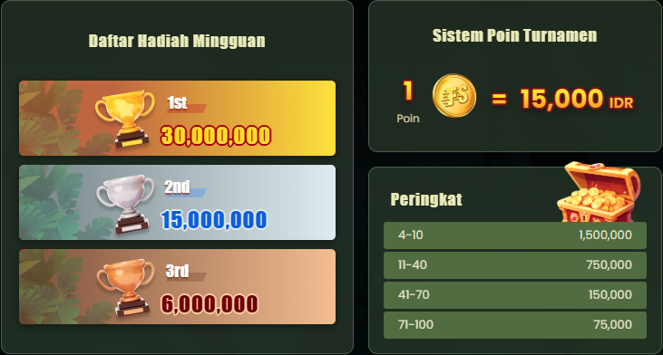 4. Turnamen harian akan berlangsung dari 19:00 WIB hingga 23:59 WIB, dengan 10,000 hadiah harian senilai Rp 2,240,000,000. Akan ada 15 turnamen selama periode promosi