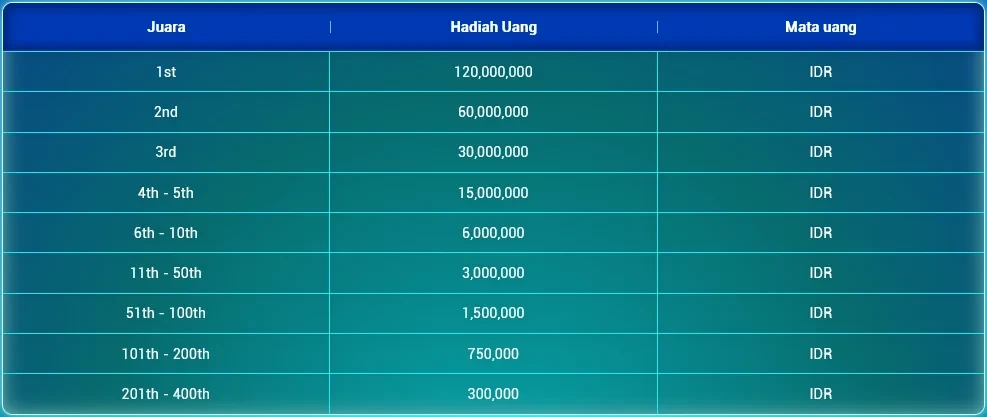 2. Total Hadiah Event ini adalah sebesar Rp 8.560.500.000 yang akan dibagikan kepada seluruh pemenang Tournamen